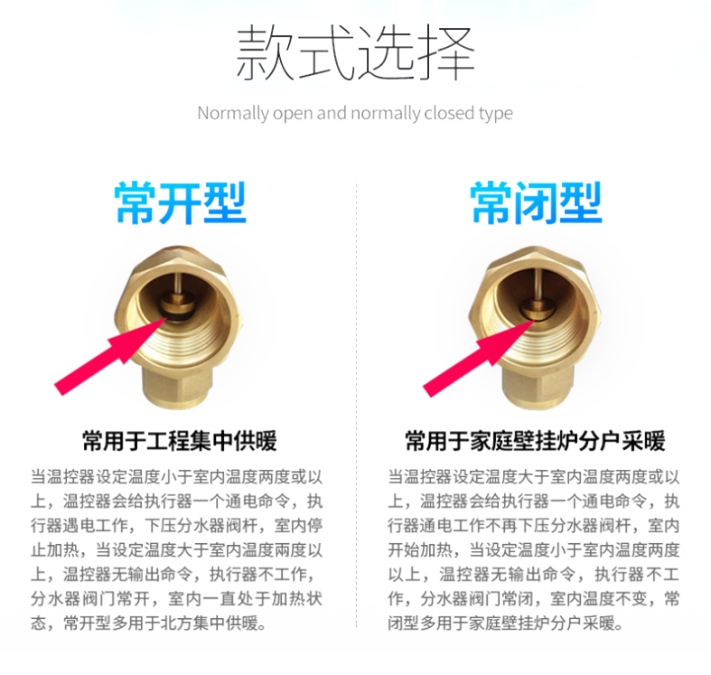 常闭执行器只适用南方壁挂炉 热源泵 空气能等设备 不能用于集中供热 常开适用北方 集中供暖