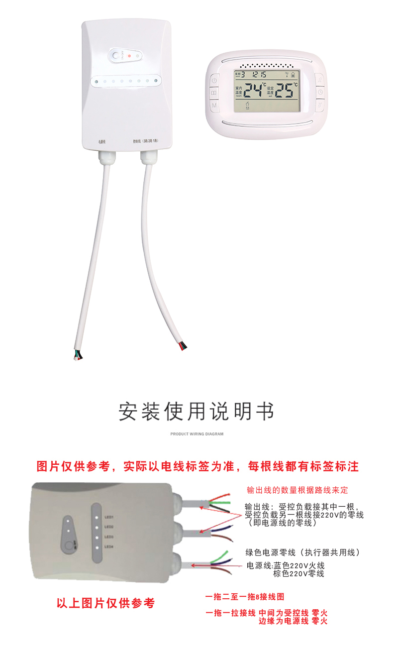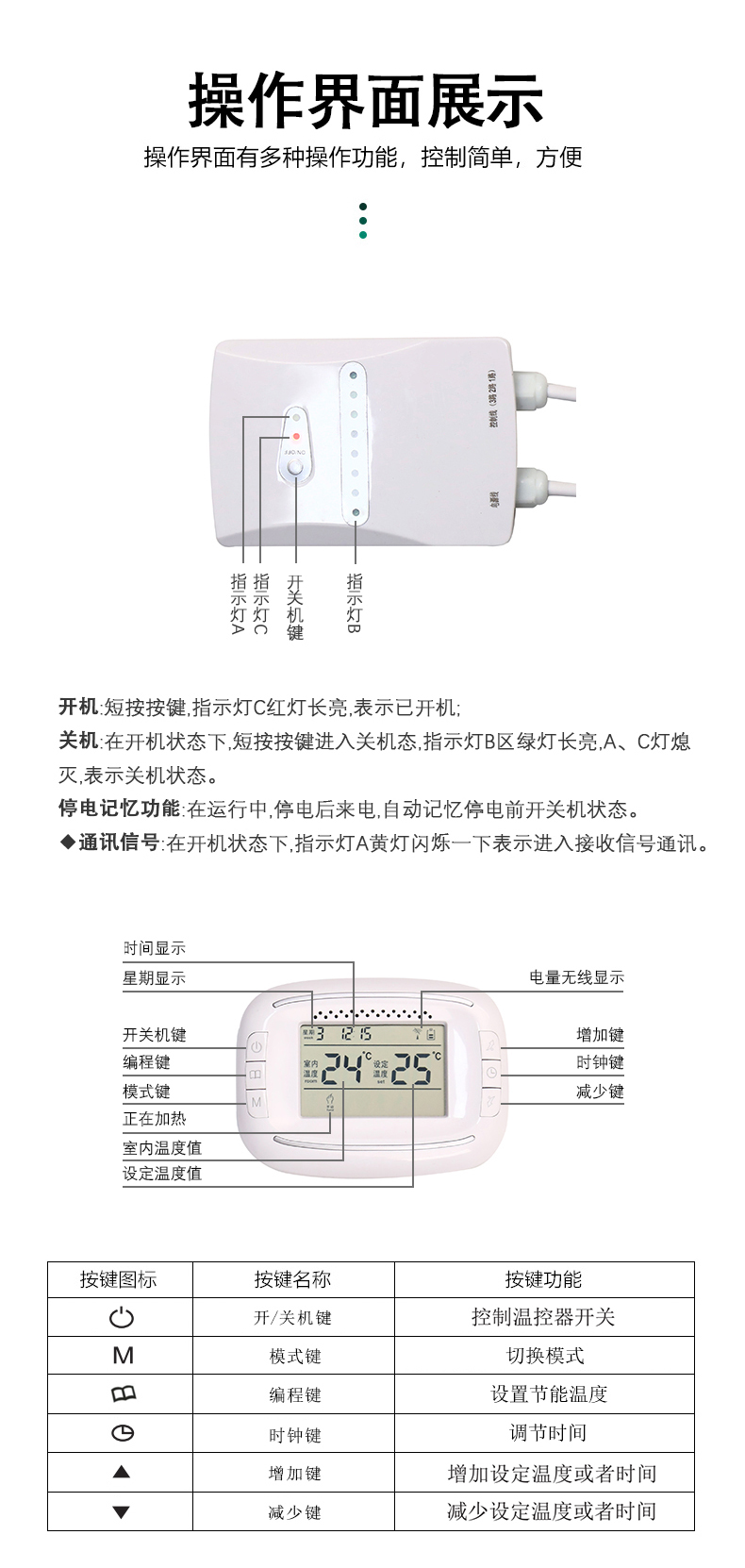 6.内置高温过热温度保护:当环境温度小于设定温度2度及以上时,温控器自动加热,当环境温度大于设定温度2度以上时,温控器自动关闭;