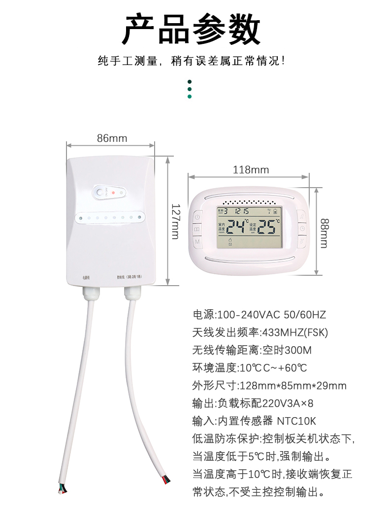 5.内置低温防冻保护功能:当环境温度小于5度时温控器开始输出防冻,当温度大于或等于8度时温控器停止输出及防冻;